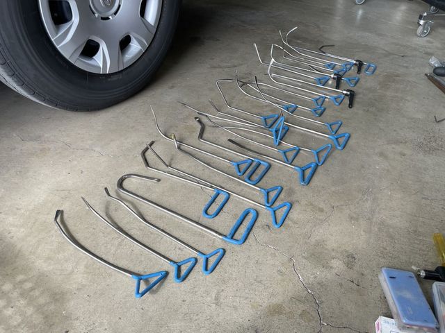 その工具も100種類以上の形状がありまして、車両や場所、凹み方によって使い分けます。どの工具が最適なのかを見極めるのもプロの腕の見せ所です。手持ちの工具でダメであればその場で工具を曲げて専用工具に改造してしまうなんて事までしてますよ。まぁ中から押し出すだけでなく外から引っ張り出す方法もあるのですけどね。