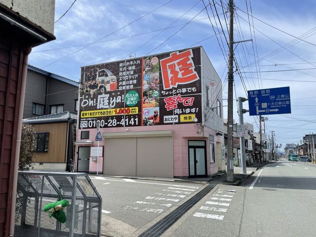 元々この壁には「トキのむら、新穂村」みたいな大きな壁画が描かれていたのですが、僕がここに入居する際にはもう壁自体がボロボロで。それを隠す為に仕方なくこんな大きな看板にするしかなかったんですよね。ウチは「Oh! 庭ya!」というFCに加盟しているのですが、本部さんにサイズを伝えたらこんな派手なデザインで仕上がって来まして…(苦笑)